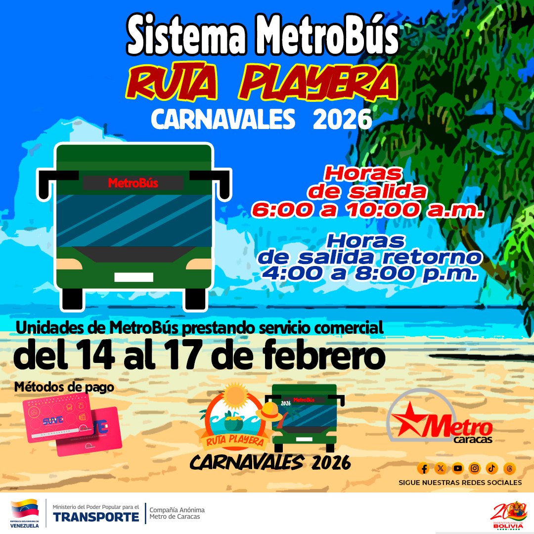 (MPPT. Prensa CAMETRO 13-02-2026).- A partir del sábado 14 y hasta el martes 17 de febrero, el Metro de Caracas, nuevamente activará la Ruta Playera por los Carnavales 2026 para ofrecer el traslado cómodo y seguro de temporadistas hasta el estado La Guaira.